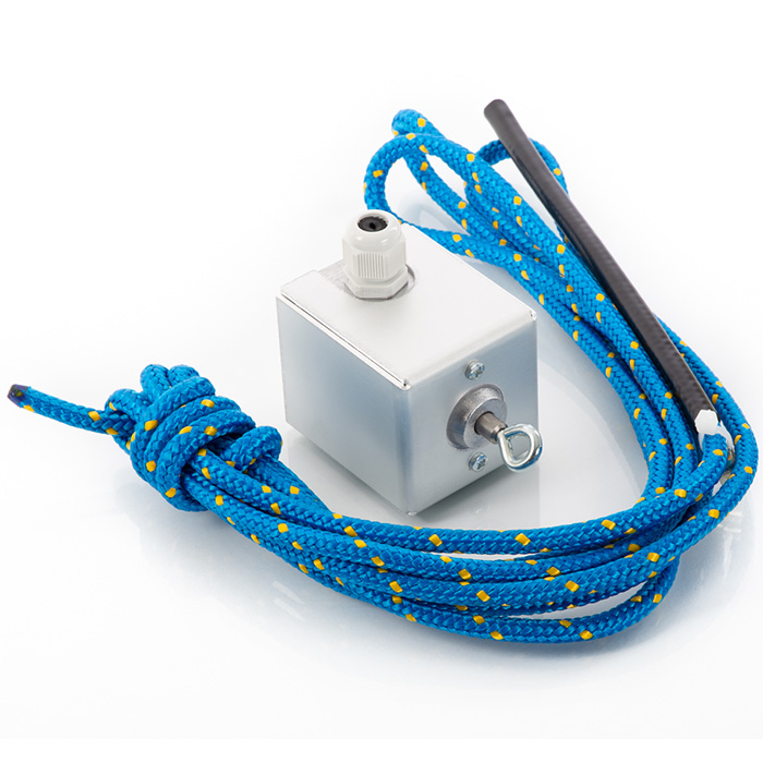 Öppningselement som aktiveras genom att man drar i ett snöre, C-NO-funktion. Används till exempel vid olika typer av portar eller till dörrar. Komplett med snöre. IP40. Klarar max 230V AC, 1A.