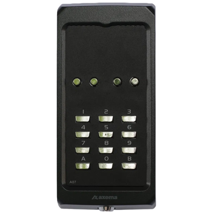 Fristående kodlås för inom- och utomhusbruk, i en mycket robust metallkapsling. Främsta egenskapen hos A07 är det extremt enkla programmeringsförfarandet, vilket är möjligt tack vare fyra funktionsknappar på kodlåset. Knapp 1, 2 och 3 används för att programmera/byta respektive kod, samt den 4:e knappen för att ställa in öppningstid på reläet.