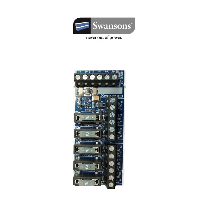 Swansons SPM900 är ett innovativt säkringskort för enpolig (+) avsäkring. Kortet har 5 grupper med individuell ledindikering för hel och trasig säkring och en gemensam larmutgång för säkringsfel. Dessutom ger SPM900 ett utökat skydd för överspänningar, åska och andra transienter. Inspänning: 10-30 VDC. Utspänning: 10-30 VDC. Max last: 10A, max last/utgång 6A. Fellarmsugång: NC (max 300mA @ 30VAC/D