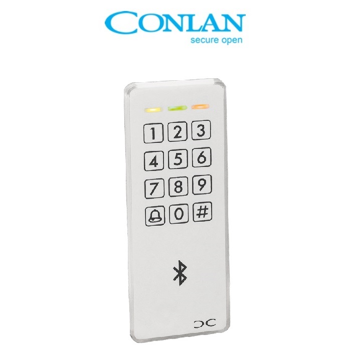 CB1000LE Stand Alone kortläsare med knappsats från Conlan för mobiltelefoner eller Bluetooth taggar. Modell: Classic. Färg: Vit. Lästeknik: Bluetooth. HxBxD: 130x50x8mm. IP67. Kabel: integrerad 2,5m 8-tråd. Inspänning: 9-42VDC (Controller 12VDC). Användare: Upp till 512 kort/koder. Utgångar: Relä och open collector (0V aktiv). REX ingång. Inkl. Conlan Wiegand controller (art.nr.245460116800)