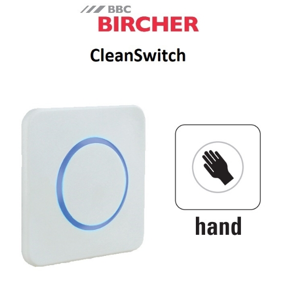 Beröringsfri öppnaknapp från Bircher med optisk indikering för infällt montage. Läsavstånd: 10 - 50cm. Utgång: Potentialfritt relä C-NC-NO. Färg: Vit. Pictogram: Hand. HxBxD: 88x88x38mm. Driftspänning: 12-24 VAC/DC. Teknik: Mikrovågsbaserad dopplerradar. Köp till CleanSwitch Dosa för utanpåliggande montering.