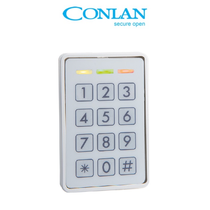 CM1000 Stand Alone kortläsare med knappsats från Conlan. Modell: Mykey. Färg: Vit. Lästeknik: Mifare. HxBxD: 75x50x8mm. IP67. Kabel: integrerad 2,5m 8-tråd. Inspänning: 9-25VDC. Användare: Upp till 190 kort/koder. Utgångar: 2st (500mA), open collector (0V aktiv). REX ingång.