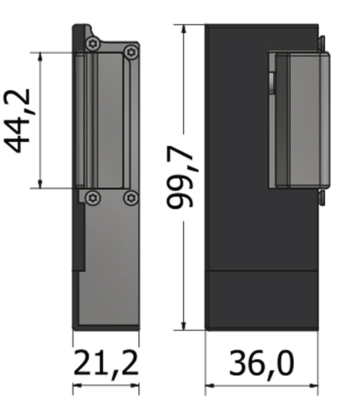 Funktion: omvänd (öppet strömlöst) Låskolvskontakt: nej Driftspänning: 24 V DC Strömförbrukning: 150 mA Brythållfasthet: 500 kg Yttermått: 99 x 21,3 x 36 mm