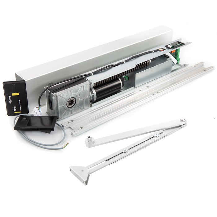 Dörrsautomatik för slagdörrar. FD10 klarar dörrvikter på upp till 150 kg och dörrbredder på mellan 730 – 1100mm. Mått: H70xB730xD125 mm. EN16005, DIN 18650. Kan monteras på karm eller dörrblad. FE/LE, vindlast etc. inkluderat som standard. Mycket tyst gång och lättöppnad för hand. Lev. med monteringsplatta, normal arm och aluminium färgad kåpa.