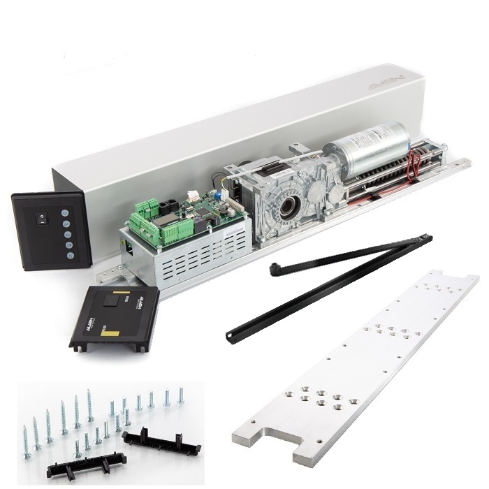 Paket innehållande 1st FD20 drivenhet artikelnr: 220FD20899, 1st RG - svart glidskena med arm för montering av FD10/FD20 på karm artikelnr: 220164ED165, 1st monteringsplatta för FD20 artikelnr: 220358698 och 1 kit med ändstycken och skruvar till monteringsplatta artikelnr: 22048132965.
