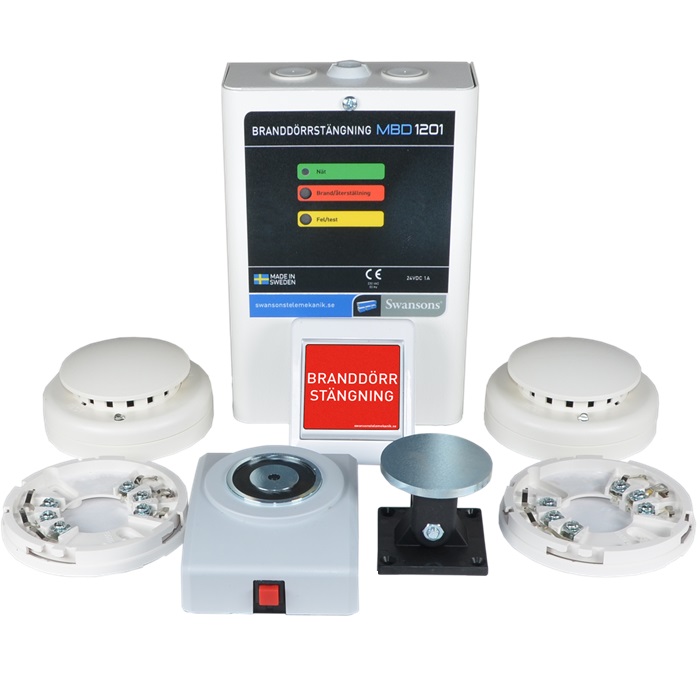 Central MBD1201 inkl. 2st Rökdetektorer DP721 och dörrstängningsknapp samt dörrhållarmagnet. Komplettera med batterier (art.nr. 255MBDBA860) för batteribackup.