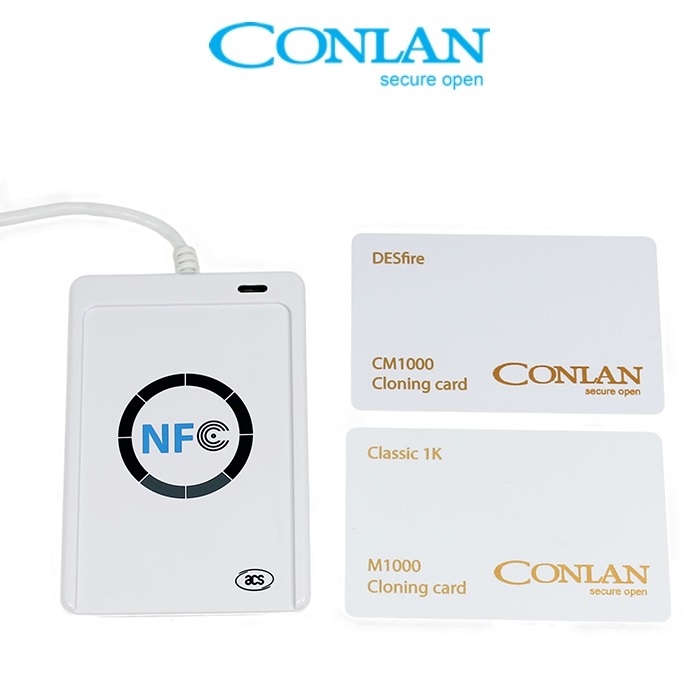 Conlan bordsläsare med USB anslutning till dator för administrering och kloning av kort för CM1000 och M1000 läsare. Andvänds tillsammans med Conlan SmartKey programvara för enkel hantering av användare. Kloningskort medföljer. Lästeknik: Mifare