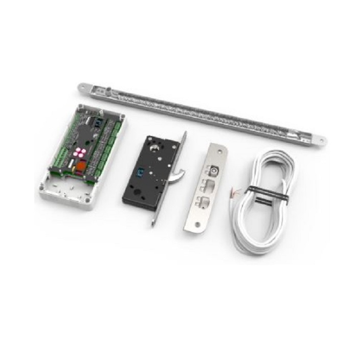 SAFETRON 6500 i satsförpackning. Satsförpackningen innehåller: motorlås 6500, styrenhet TC CU2, anslutningskabel C06 (10m), slutbleck 107-2 samt karmöverföring CT81.