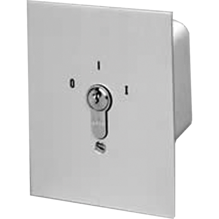 Nyckelbrytare med skylt för infällning med mekaniskt lås på lådan, levereras med profilcylinder och 3 nycklar, lättmetallhölje, skyddsklass IP 54. 1R - Fasta positioner, nyckel infällbar i PÅ och AV-läge. Växelinsatsens funktion kan omprogrammeras