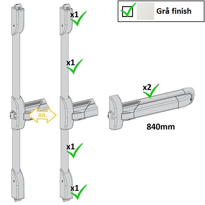 ISEO - Trycksregelset bestående av 2st tryckregel (1356001030) och 1x stångsett för fallkolvar (135T94100207030) samt 1x fallkovsset (135T9410201704030). 2 resp. 1-punktslåsning, fallkolv (vertikal låsning). Dörrhöjd max 2400 mm. Anti Germ = antibakteriell yta. Grå finish. EN1125