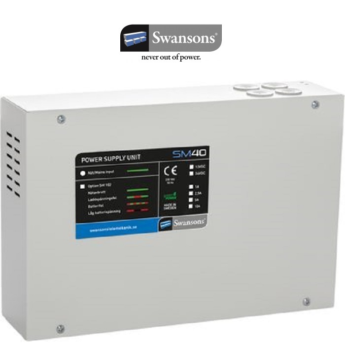 Swnasons strömförsörning med plats för batterier för batteribackup (betterier ingår ej). SM40 är primärwitchad, högeffektiv och har stabiliserad och filtrerad utspänning. Aggregatet är skyddad mot överbelastning och kortslutning. Nät, last och batteri skyddas av säkringar. Inspänning: 230 VAC +/- 15%. Utspänning: 27,3 VDC. Utström: 3A. Batteriplats: 2x9 Ah. Storlek (HxBxD): 210 x 310 x 80mm. Färg: